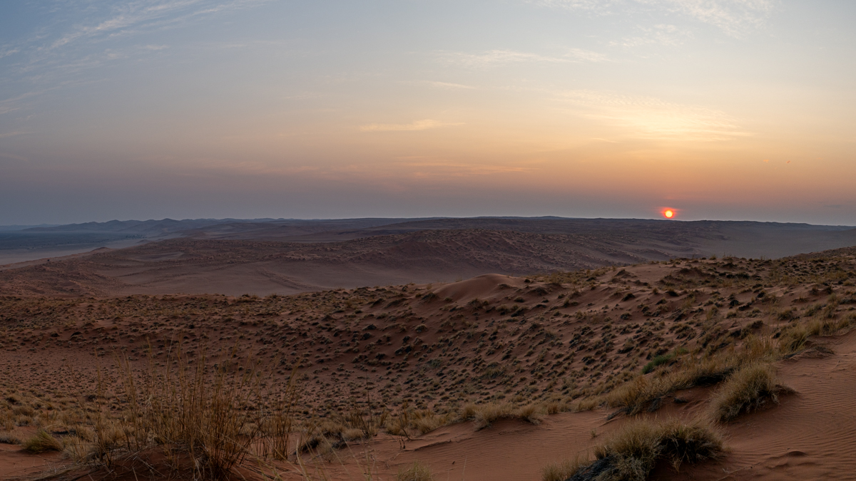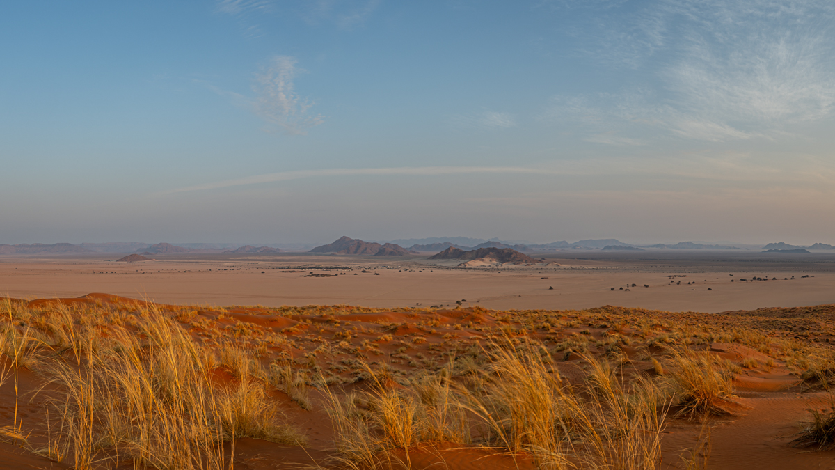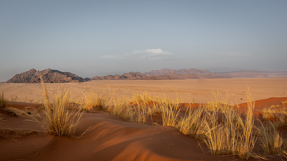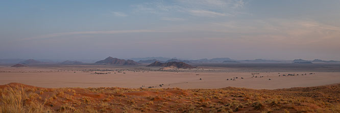 Der Ausblick in eine schier endlose Weite mit sich darin erhebenden Bergketten und dem dazugehörigen Licht- und Farbspiel sind absolut beeindruckend. Insbesondere der rote Dünensand mit dem gelben Gras im Vordergrund ist fantastisch und ein Kontrast zur Sossusvlei und dem Dead Vlei.