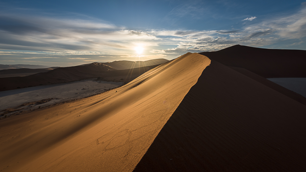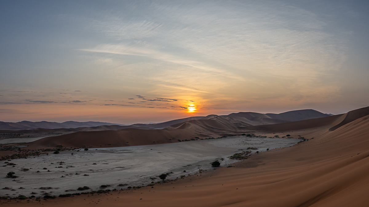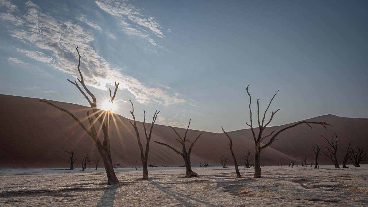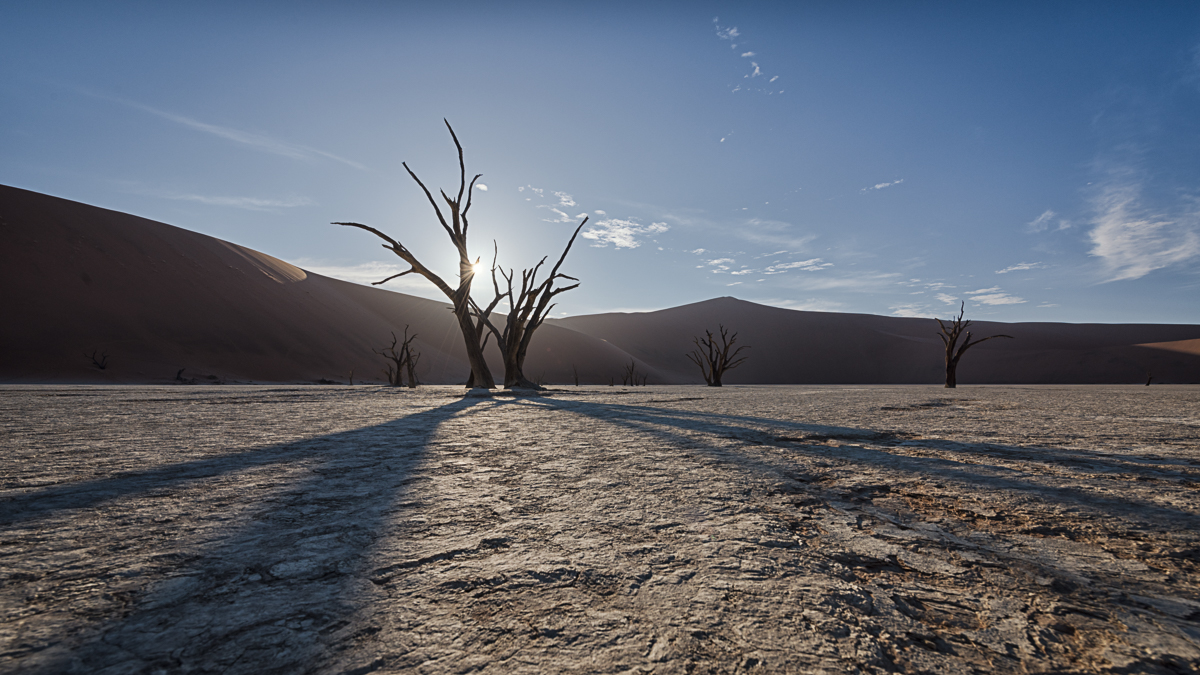 Geniesst den Sonnenaufgang mit nur wenigen Menschen auf der unberührten Düne, es ist immer wieder magisch und die vorherige vorher absolut wert. Die Sonne steigt schnell höher und fängt dann langsam an in das Dead Vlei zu fallen, der fotografische Höhepunkt nähert sich. Vom Dünenkamm aus könnt ihr während das Dead Vlei noch im Schatten liegt die Düne herunterlaufen, ein ganz besonderer Spaß.