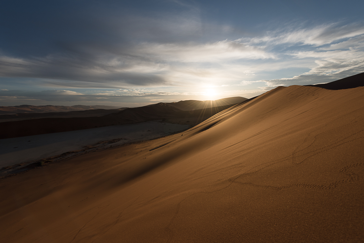 Wenn Ihr die erste Anfahrt geschafft und den Dead Vlei Parkplatz auf der linken Seite gefunden habt, dann liegen alle wesentlichen Erfahrungen hinter Euch, um am kommenden Morgen den Sonnenaufgang in der Sossusvlei auf einer Düne erleben zu können.